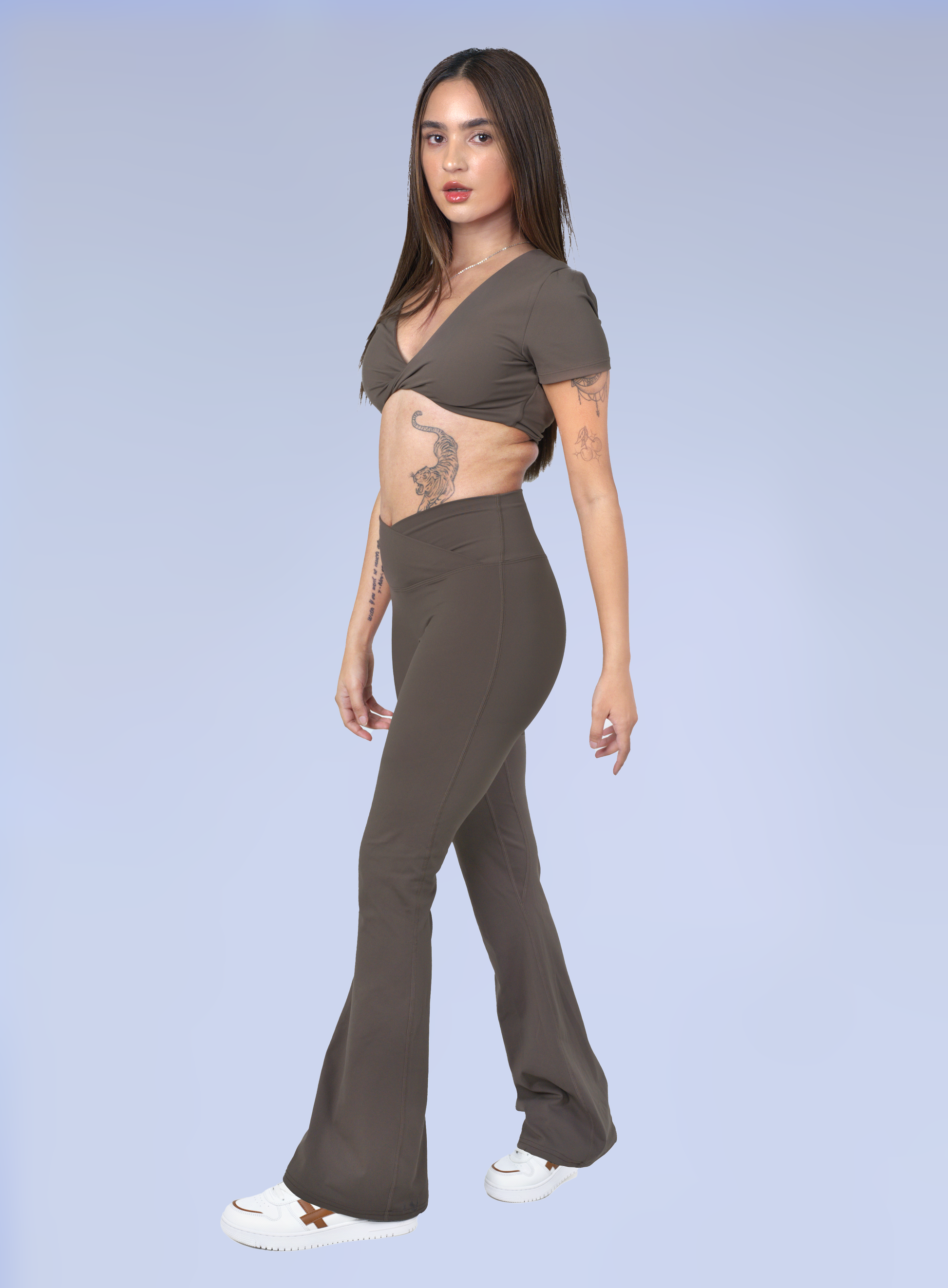 The stylish twist-front crop top and the figure-flattering V-waistband flare pants work together to create an instantly chic, body-contouring look. Crafted from our buttery-soft, supportive fabric, this set delivers all-day comfort and confidence whether you are running errands or flowing through a yoga session.