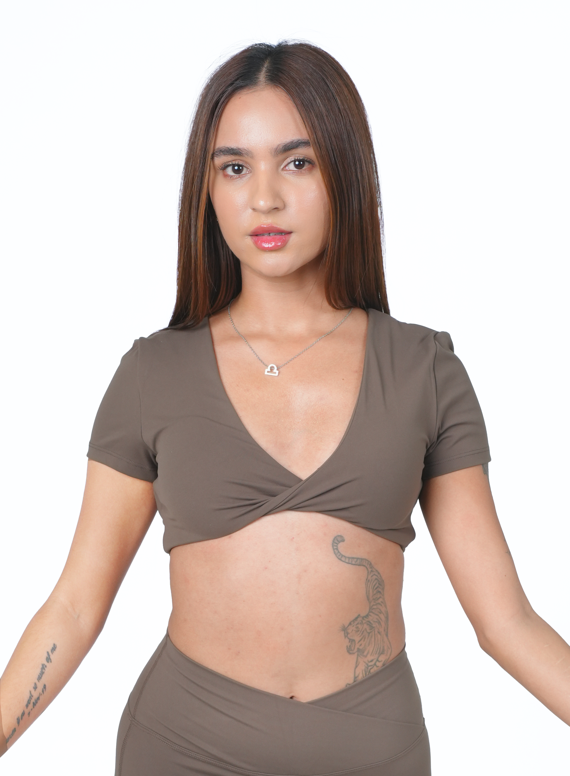 Elevate your active and casual outfits with the Serenity V-Neck Crop, a stylish essential designed to flatter and perform. This versatile top features a chic twist-front detail that creates a defined V-neckline and a modern, airy cutout back, offering the perfect blend of fashion and breathability